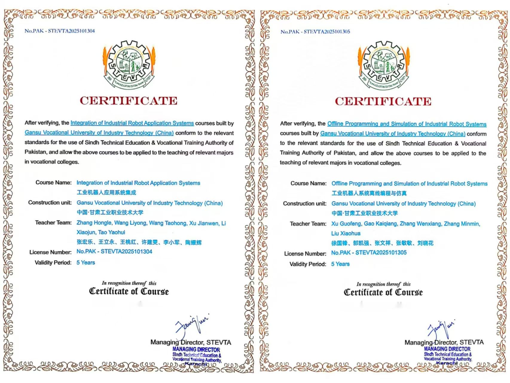 近期,我校智能制造学院工业机器人技术专业教师团队开发建设的《工业机器人应用系统集成》《工业机器人系统离线编程与仿真》两门课程,正式获得巴基斯坦官方认证,并被纳入巴基斯坦国民教育体系有效应用。